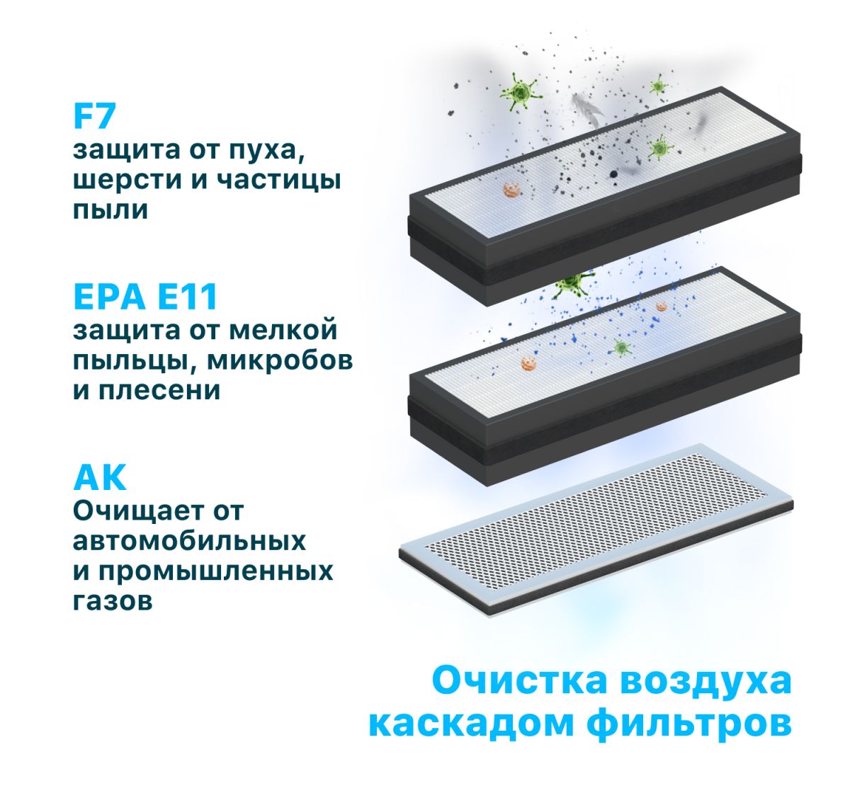• Медицинский стандарт очистки воздуха - каскад фильтров: F7 + HEPA H11 + AК