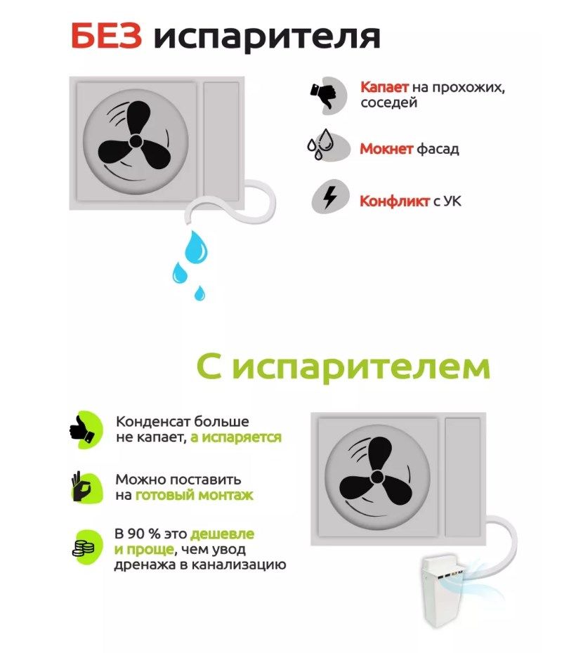 В современных домах, управляющие компании запрещают выводить капающий дренаж на улицу, испаритель полностью удовлетворяет данное требование УК и застройщика: вода не будет капать на прохожих, не будет разрушать фасад здания, соответственно Вы защитите себя от жалоб управляющей компании и недовольных соседей.