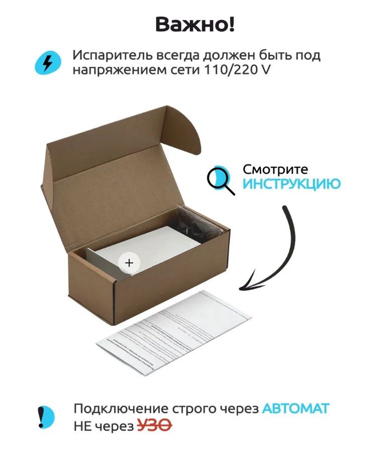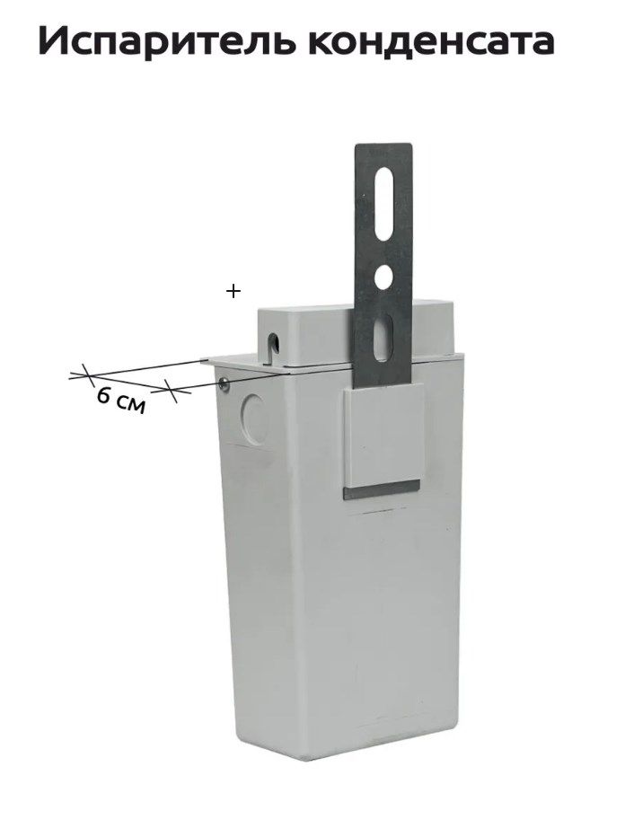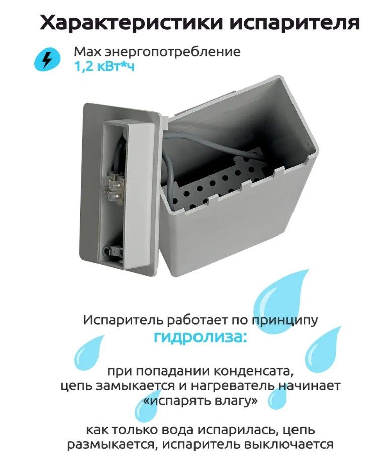 Электронный испаритель влаги предназначен для испарения конденсата образующегося в результате работы бытового кондиционера. Прибор монтируется на улице рядом с наружным блоком сплит-системы, дренажная трубка ведущая от внутреннего блока сплит-системы заводится в испаритель. При работе кондиционера конденсат через дренажную трубку попадает в испаритель, далее при наполнении емкости конденсатом, прибор автоматически включается и начинает испарять накопленный конденсат в атмосферу через специальные отверстия. Процесс испарения происходит за счет превращения воды в горячий пар работе нагревателя.