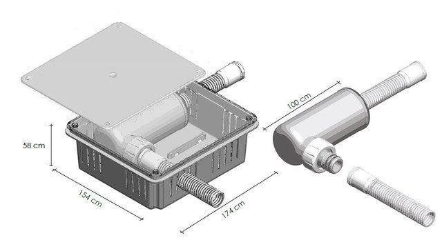 - В стандартную комплектацию Vecam mini входят: пластиковый бокс с крепежом, уплотнительные резиновые кольца, прокладка, соединитель диаметром от 16 до 32 мм для присоединения дренажных шлангов.